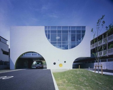 La façade du Cours d’anglais de la Rose blanche à Takatsuki au Japon affiche un design très espiègle. L’architecte Naoko Horibe a choisi des demi-cercles comme expression de la vivacité des enfan